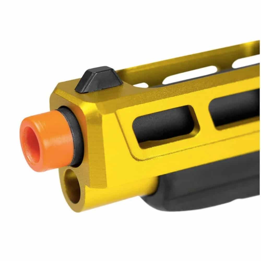 A Pistola Airsoft ARMY R34 Custom Type F é fabricada pela Army Armament com Slide de alumínio CNC amarelo e empunhadura em polímero de alta densidade, semelhante as Glock reais. O CNC (Computer Numeric Control) é um sistema informatizado que proporciona o controle de máquinas, utilizado principalmente em tornos e centros de usinagem. Ou seja, essa Pistola é produzida com o que há de mais moderno para oferecer qualidade!